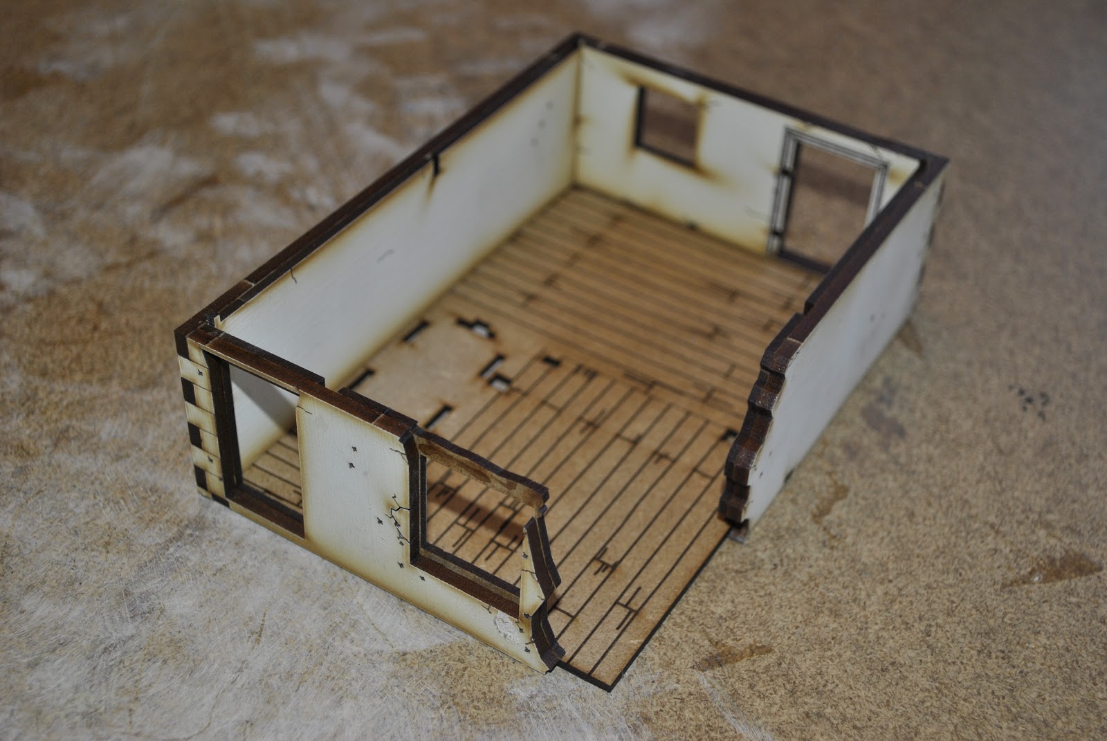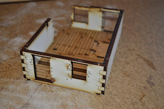 Here you can see the completed outside/inside walls. The outside walls use the 3mm MDF while the inside walls use the 2mm MDF thickness. What is very slick about this is that not only are the inside walls now also painted but the glue (glue lines) is hidden between the outside and inside walls.