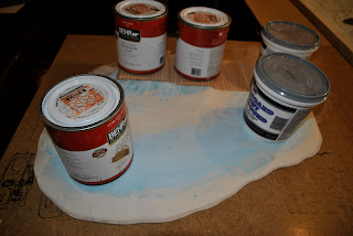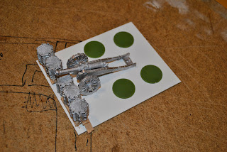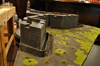 The general idea was to have a cascading platform for the four guns that was "dug" into a small hill. I used the normal blue foam, MDF, mapboard and balsa wood (dowels and planks) to build out the structure. I used the Tippi foam cutter once again and was very pleased with the results. For the foam I cut out the general shape then used sandpaper to smooth it all out. Lastly I applied plaster (still drying in the picture) to grade the hill some more.