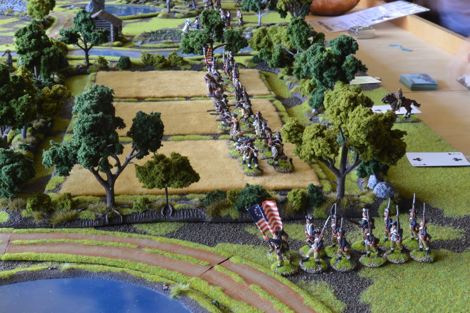 M&T: Uses a deck of cards that provide actions for unit types (regulars, irregulars, Indians, artillery, etc.). Most units get 4 actions per turn, however the order in which those actions come up is randomized by the order of the cards. Actions include move, reload and shoot.BAB: Uses a deck of standard playing cards where each card is assigned to a specific unit in the army. Two cards are resolved at a time (if conflicting in their actions, roll off to see who has initiative). Actions include move, fire, load and charge.