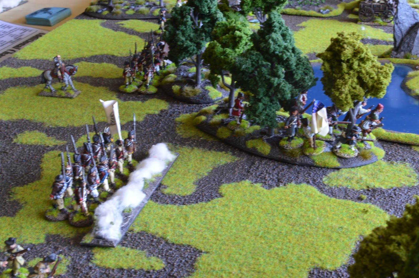 M&T: Shooting muskets is 0-4" point blank, 4-12" effective, 12-24" long range. To-hit uses the units shooting characteristic, modified by shooting modifiers (terrain, range, etc.), and once hits are scored, the weapons firepower determines was is needed to "kill" the targets. Kills trigger a reaction test (morale test). Troops are marked with black powder markers and must spend an action to reload before being able to fire again. Models are fired individually, so it is possible to have part of a unit reload and part of it firing in the same activation.BAB: Shooting muskets is 0-10" effective, 10-20" long range. To hit is based on a D10 system (remember, 0's are zero's and not 10's). To-hit is based on the terrain the target is in - open, soft, or hard cover - and modified by the usual circumstances. Each hit cannot be saved and results in a casualty and subsequent morale test.