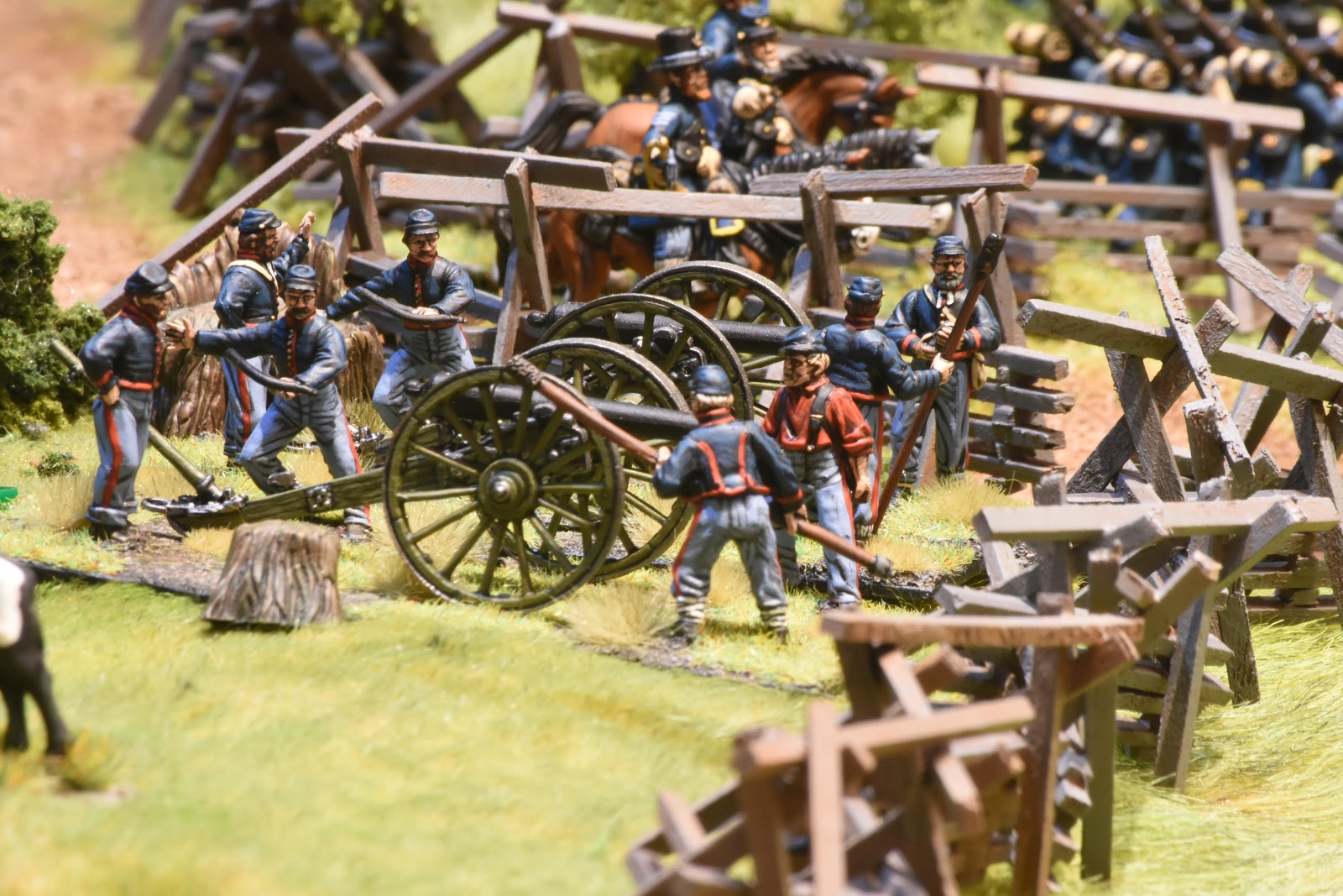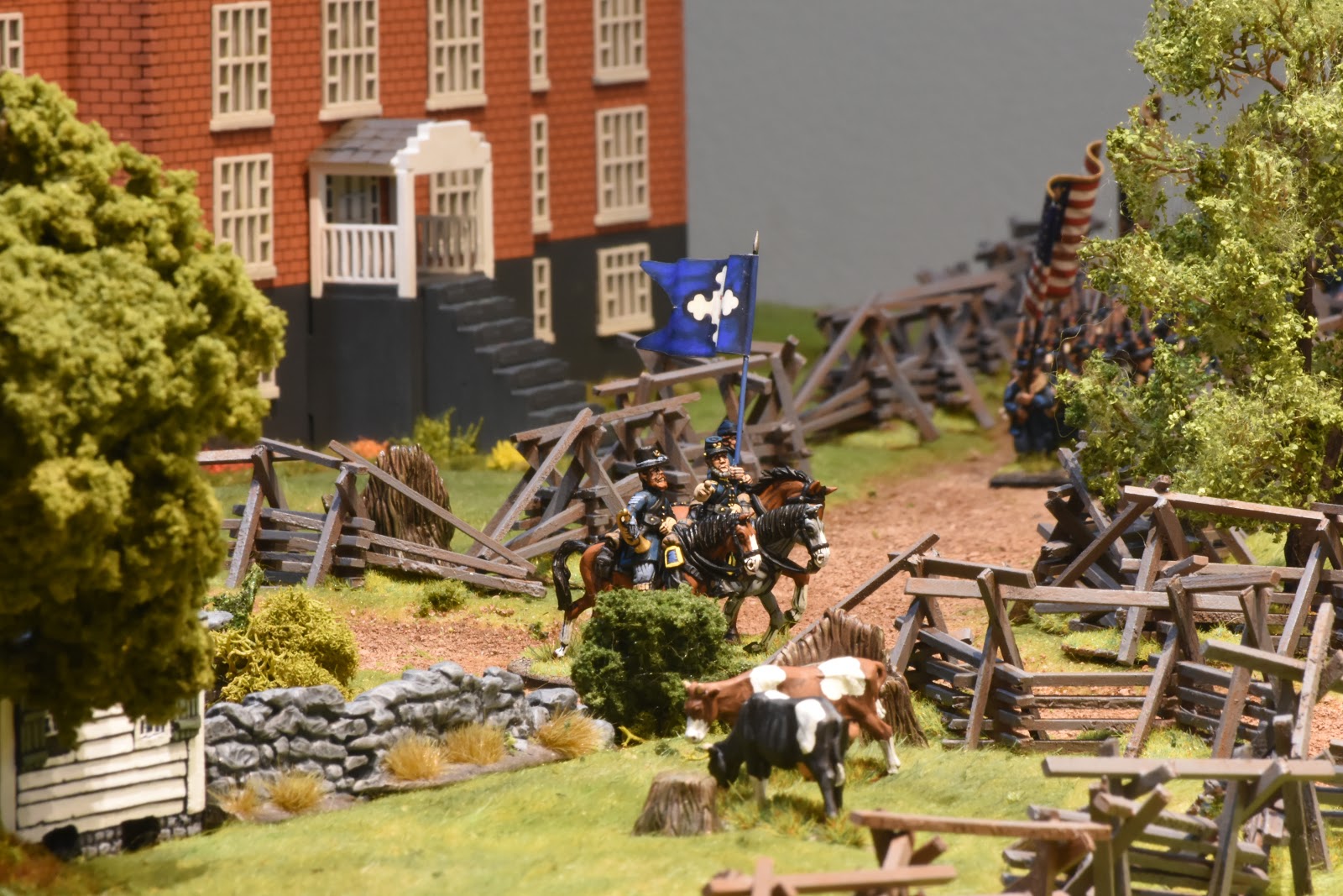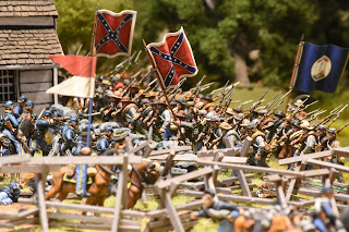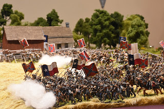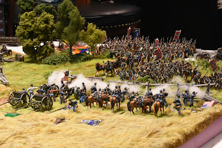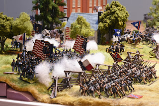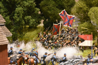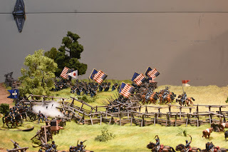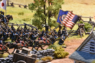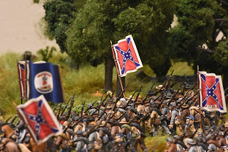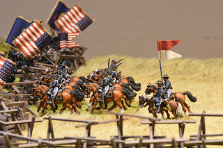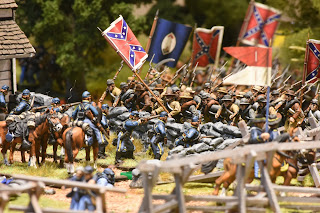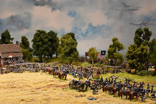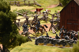 This is a tough scenario for both sides. Buford starts with 3 cavalry units and a battery of guns deployed to hold off a massive wave of Confederate units. The Confederates start with elements from 2 brigades on the table, but this quickly increases to 3 full strength brigades - which makes it a tough decision for Buford. Potentially sacrifice the entire Union cavalry brigade to hold up the Confederate advance, or fire a couple of turns and get the heck out of dodge? I held a turn to long and it cost me dearly. While the majority of the brigade ending up retiring, Roy was able to bring down effective fire on the withdrawing units, which had been badly mauled by melee with Confederate infantry units. The result, the withdrawing units broke - this hit me later in the game.