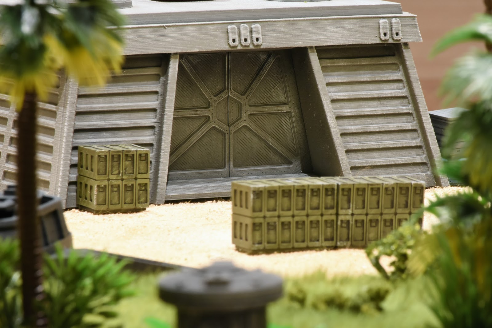 Below is the scenario map showing a 2 foot by 3 foot table. Balin's tomb is 2 feet square. The tomb is located in the center. The dark grey shows the 2" raised around surrounding the tomb. The 4 black squares are pillars, the the black circle is the well. Stairs to the raised level are located to the left and right of the gate into the tomb.