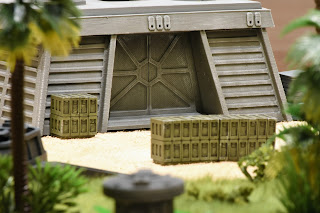 Below is the scenario map showing a 2 foot by 4 foot table. The "stairs" start at 8" high, decreasing by 1" at each turn. Each connection point between two lengths of stairs has a staircase and a column of rocks for support. This is important because "case dwellers" can climb these rocks up onto the staircase. The left side black area is a rock wall with a central cave opening (no door).