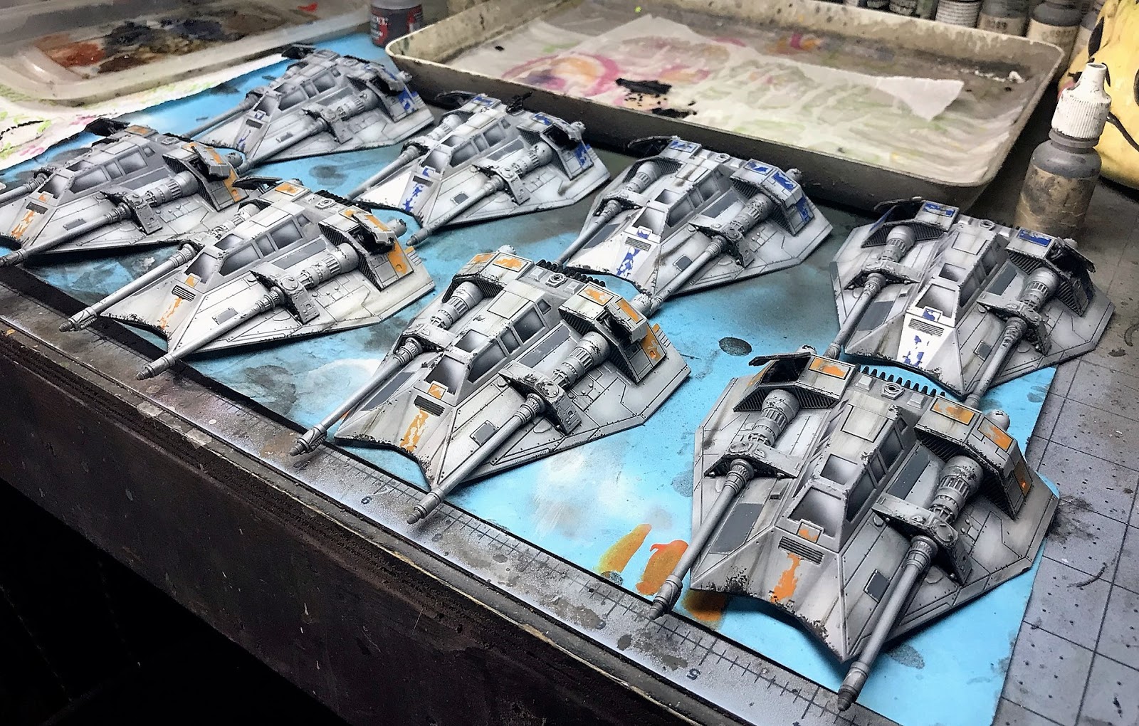 I have 12 x T-47 Air Speeders ... 4 for blue squadron, 4 Rogue squadron, and 4 green squadron. I also have 6 x AT-ST that are done. I've purchased models from Fantasy Flight Games Star Wars Legion for the majority - but I also have miniatures, primarily specialists and characters, from Skull Forge Studio (3D printed from Shapeways) and Alternative Gaming Miniatures. I have 4 x 3D printed laser turrets from Imperial Terrain.