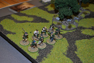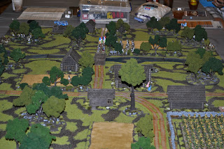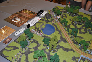 This was perhaps the best game of the weekend as it was a narrow run thing throughout each turn. The pictures onthe blog show the table ... with the British having to make a mad dash for the town while the French forded the main river. Two groups of civilians ... one of 3 models ... the other with 2 models (used the LotM characters). Side plots --- British got the "my precious" one ... with some barrels of ale going down wihtin 8" of the officier ... they managed to keep any grubby French or Indian hands off of the ale throughout the game so the British met that objective. The French officer was an imposter! He could not get closer than 4" to any friendly unit or be recognized as a poser.