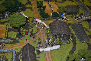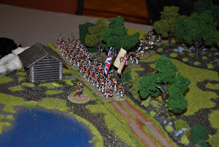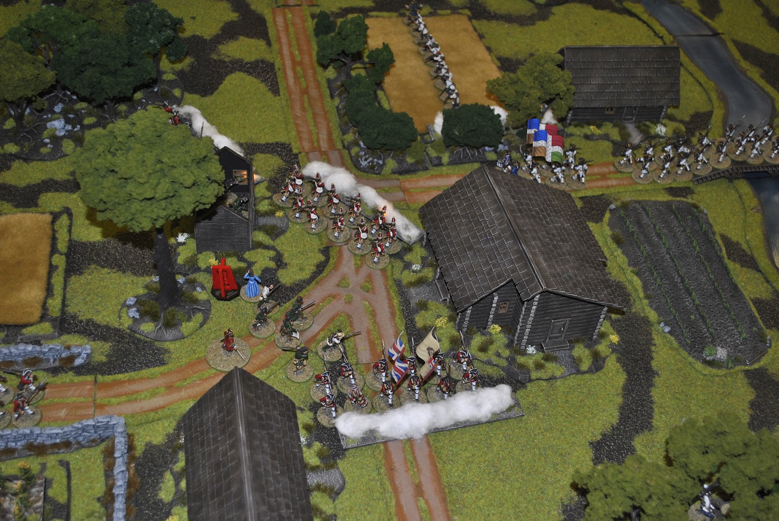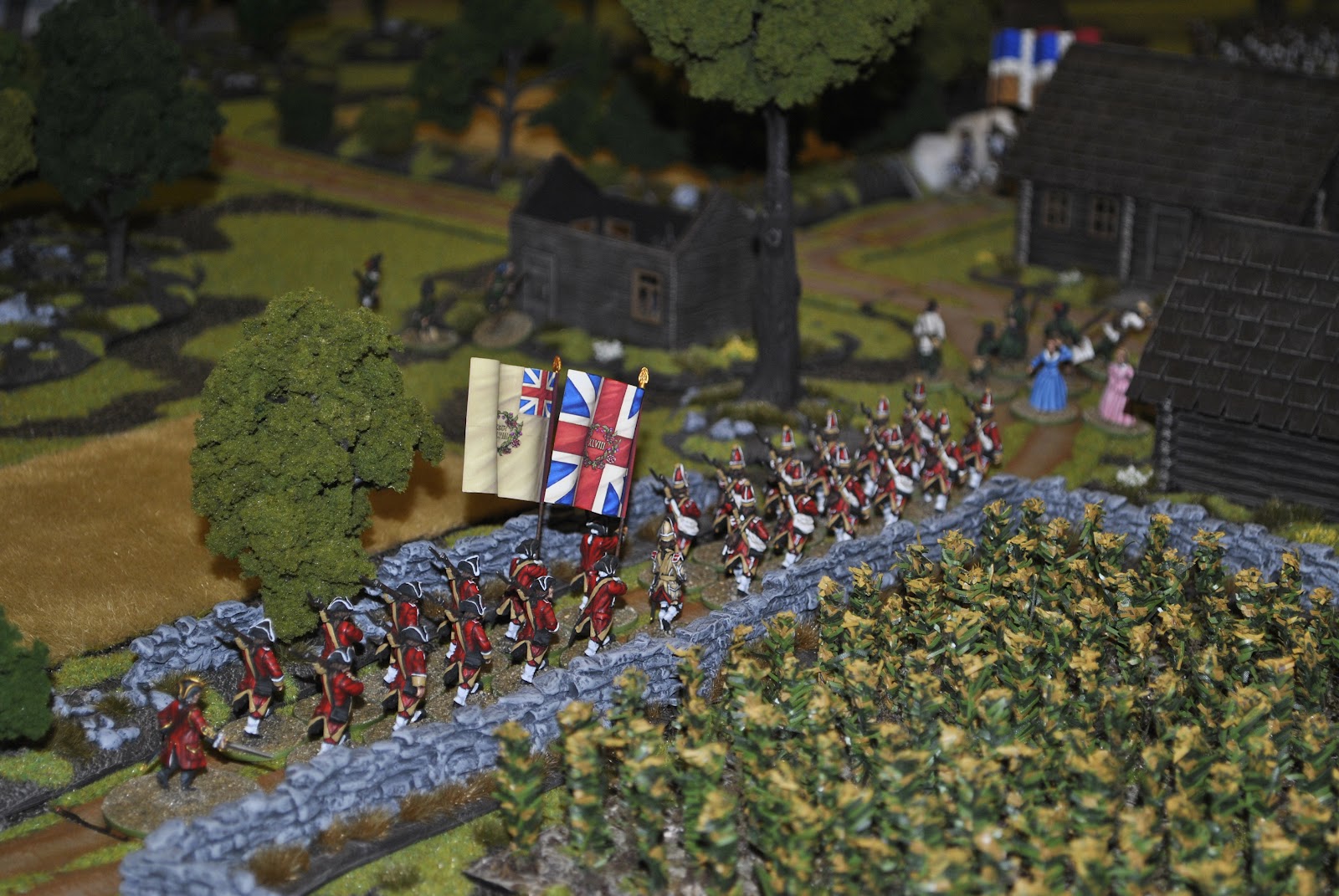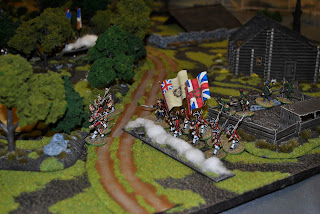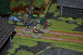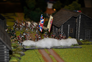 Played on a 4'x8' table. The French come on strong but the British are able to get into the middle of town first. There are 7 buildings (size 2) on the table --- so we need put forth that the French would win if they could burn at least 1/2 of the buildings (4). To light a building on fire we needed to get 4 smoke markers ... with the building collapsing when the smoke markers got to 8. The The French regulars put forth a hard fight against the British regulars but one of the random events (all units must take a reaction test if you've lost at least 1/3 of your models) cause some of the regular units to recoil ... so they welcomed a second wave of British volleys when they got back into position (behind stone walls ... but the British rolled very well). The Compagnie Franches de la Marine managed to lite one building on fire while the Indian allies and their leader got another one cooking