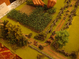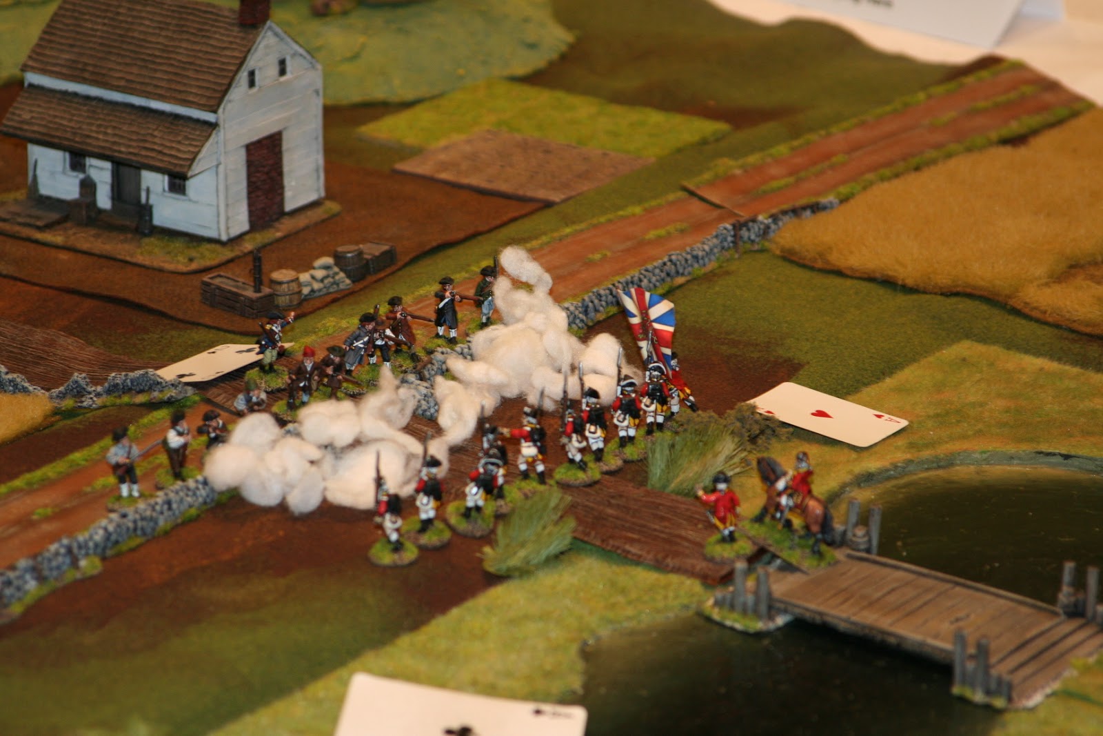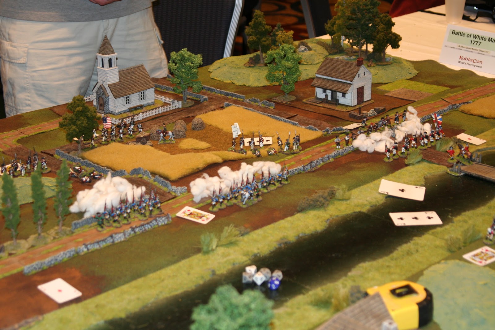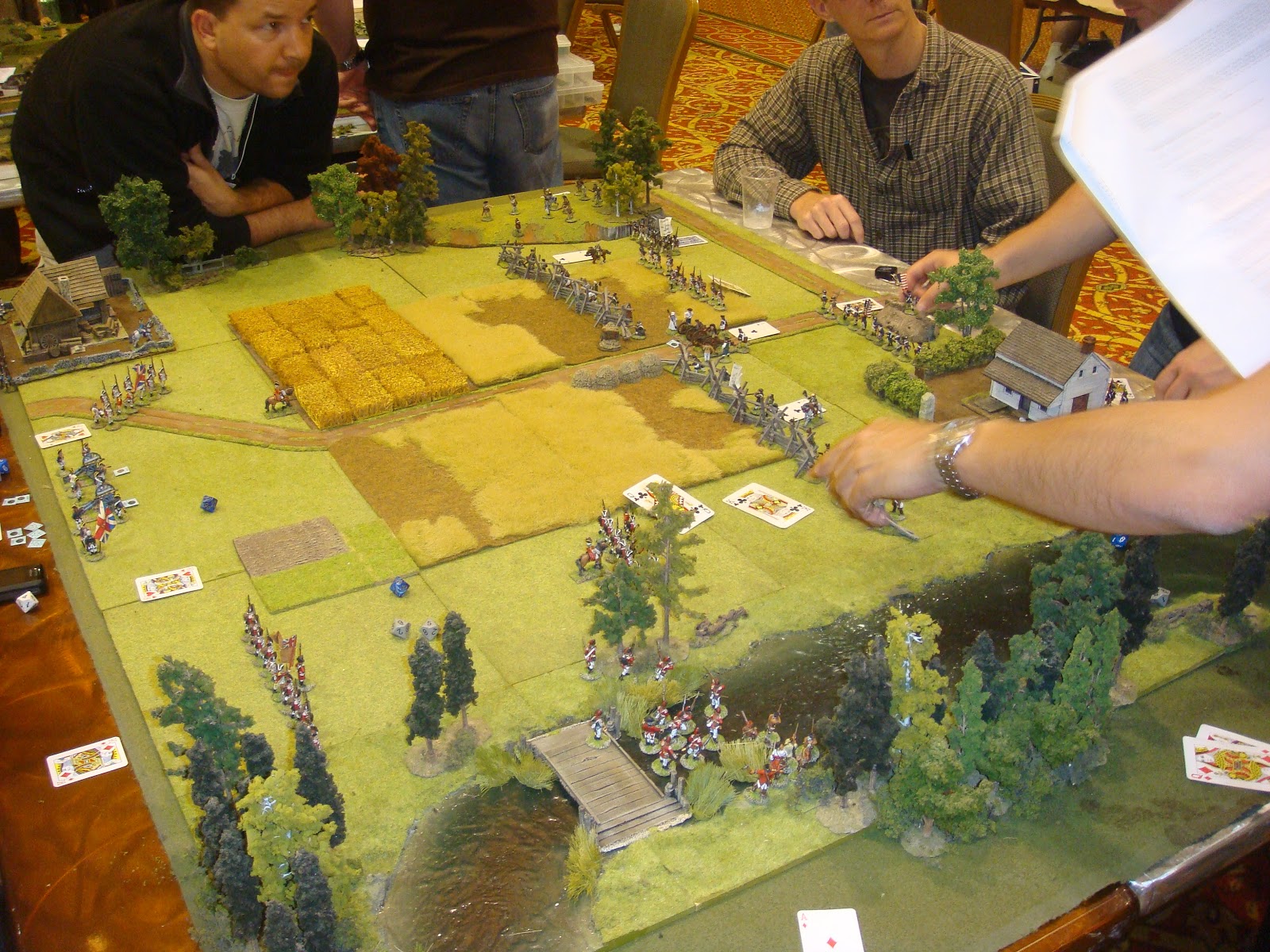 I have been attending local conventions in the San Francisco bay area for some time now and I've managed to collect some great pictures of various games. One of the best that I've seen in terms of terrain and figure quality has been run by a local guy who has run ACW and AWI "Brother Against Brother" wargames for a long time. I always admired his terrain setup - all the little details he puts out - very inspiring. I figured I would share my pictures of his games through the years for anyone looking for terrain inspiration.