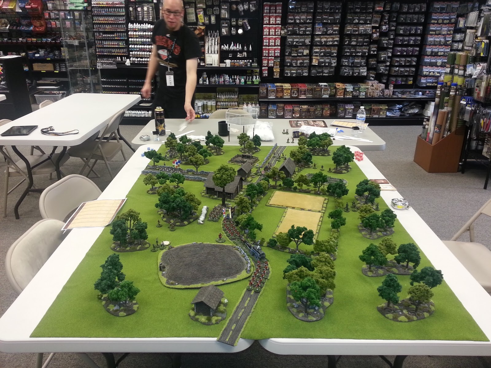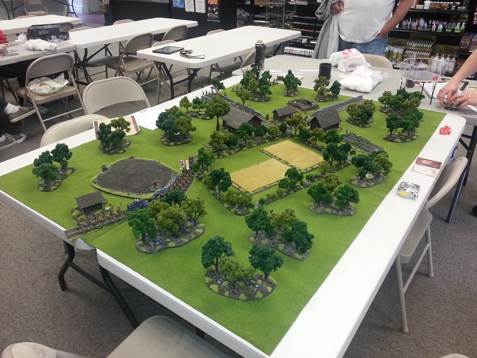 I was fortunate to get a game of Muskets and Tomahawks in today at my local game store (Game Kastle). The ever friendly and helpful Seth played the French and Indians while I took on the role of the British.