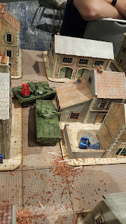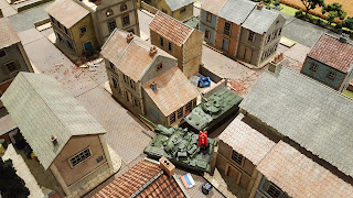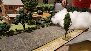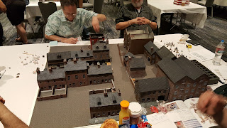 This was also the first game where I got to use my newer Crescent Root Studio buildings in a significant way. They buildings can work for modern --- although we need to add a lot more "modern" look and feel to the tablestop, this is a great start. We used black tar roofing shingles (the underside) for paved roads.