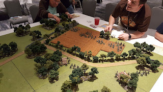 Roy Scaife from our group put on the same game we play tested earlier this month (covered in a previous post). We had a full house and everyone enjoyed the game. The British manage to win again, but it was a lot closer this time - they managed two break two of the four French brigades - but they had one Brigade already broken and two others almost broke before they managed to pull it off.We used my Napoleonic variant of my This Hallowed Ground rules called Empires At War --- they rules worked very well and we played through the game in a very reasonable amount of time.