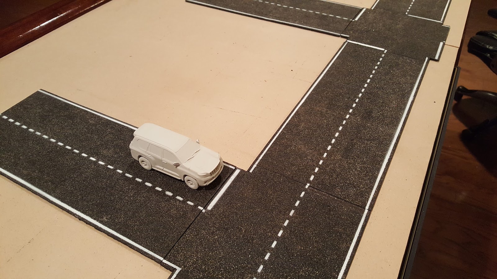 I decided to do the markings rather generic. I bought some white spray paint but you could of course use different colours. I also decided to do the intersections with the cars driving on the left side of the road ... I'll also do intersections for the right side of the road as well - and - because of the way I marked the straights, they'll work for both types of intersections/junctions.