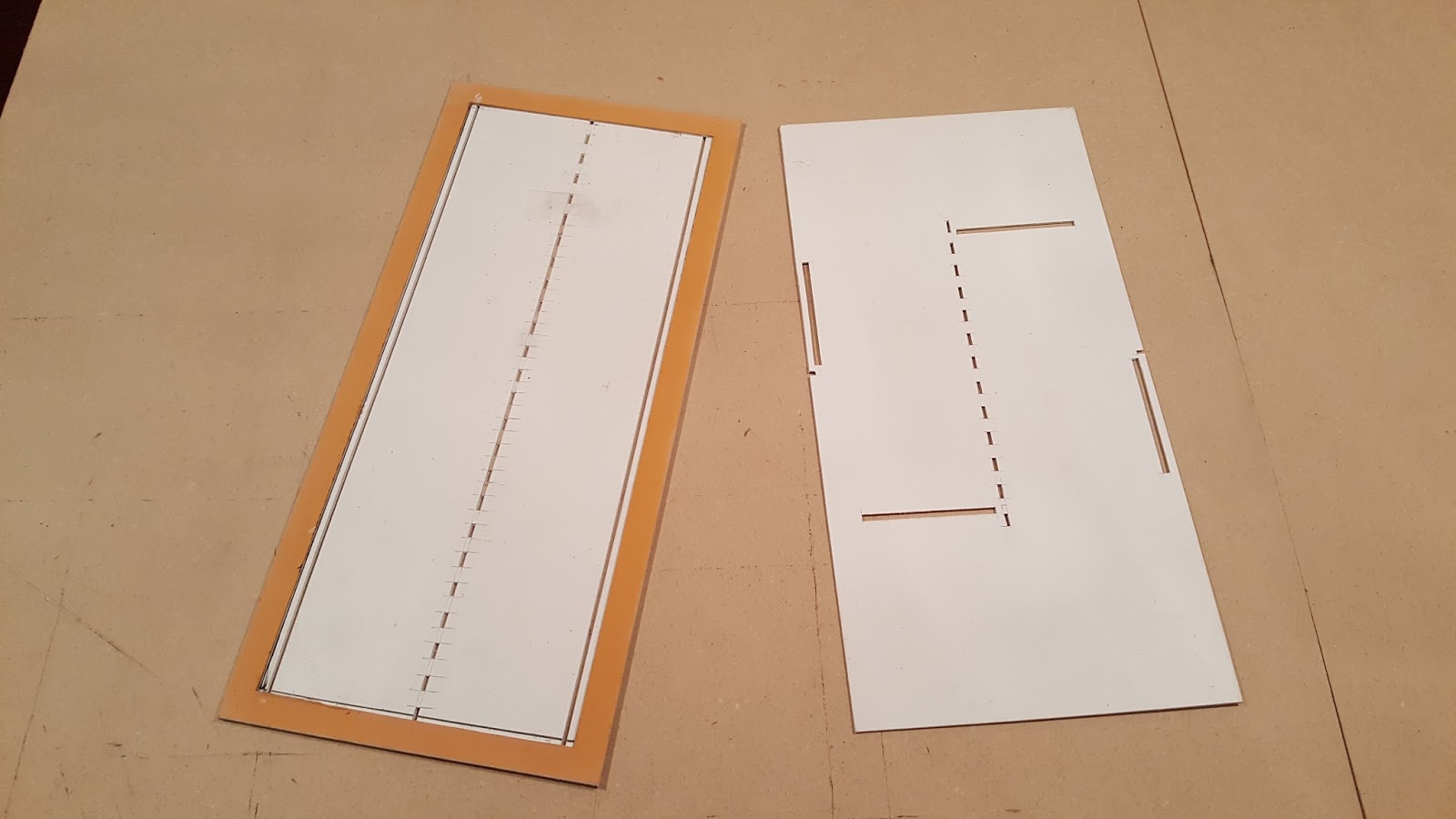 Alright, with my material selected and my measurements ready, I used some cardboard to create some stencils for the road markings. Cardboard works for me - but of course you can use anything that is "stencil" worthy. You can see the two stencils I created below. This is the most difficult part of this entire project. Once you have the stencil done though, you can reuse it for all your roads.
