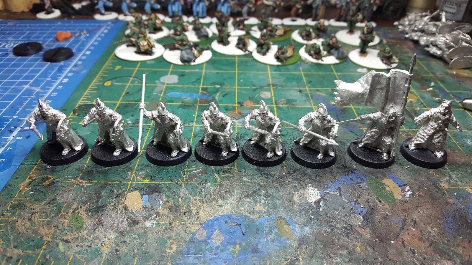At the same time while waiting for plaster to dry, I've gotten a start into assembling all the miniatures I need.  I've begun with the forces of good - the dismounted Rohan warriors and Galadhrim.