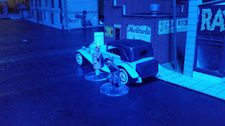 One thing Ivor has done that has really engaged my brain into overdrive is use blue lights to play "night" games ... oooooooooooo!!!! Check out his game here. I've already source small battery powered LED lights ... rethinking my Pegasus Bridge game and others (including modern night games) using the blue light approach with LED lights for "lamps" and I plan to use tea lights in buildings (with plain white paper wrapped around them to diffuse the light). Exciting possibilities here ... thanks IVOR! A couple of pictures from Ivor's excellent blog below --- I recommend checking it out.