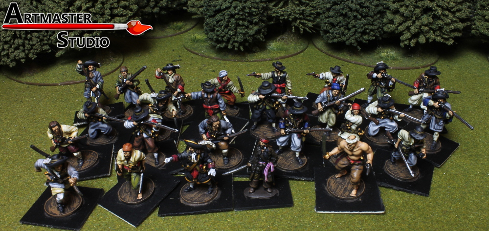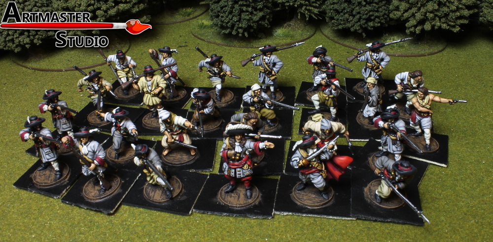 Each faction is 26 miniatures. For the English, this is a captain, Henry Morgan (special character), a unit of Forlorn Hope (can also be a Buccaneer Storming Party), two units of Freebooters, two units of Militia, and a unit of Sea Dogs. This constitutes the starter set for the English faction.