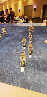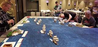 In addition to the above games ... we pulled out the ships on Friday night after the Roncevaux Pass game and played a smaller engagement just for some ad-hoc fun. Tons of pictures presented in the order of the games being played at the con below.