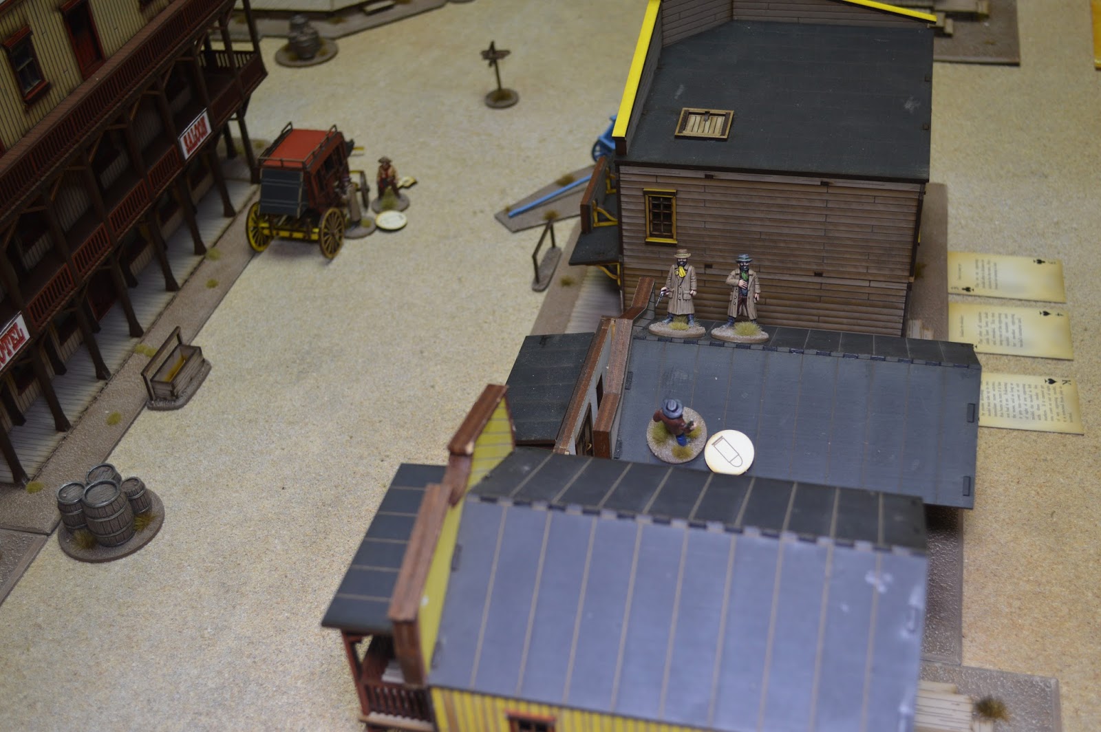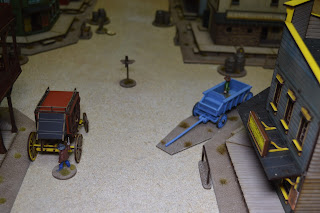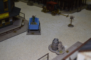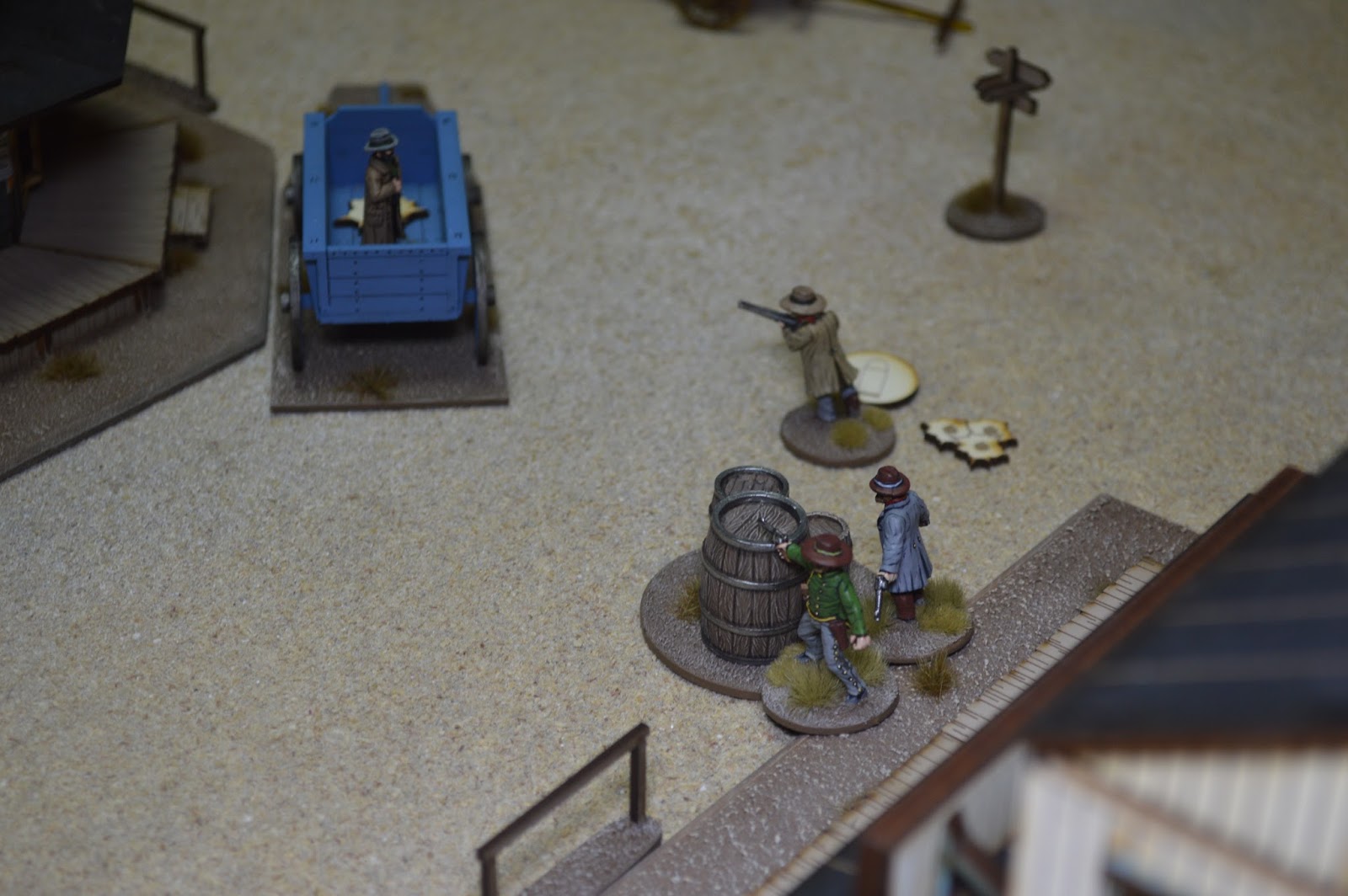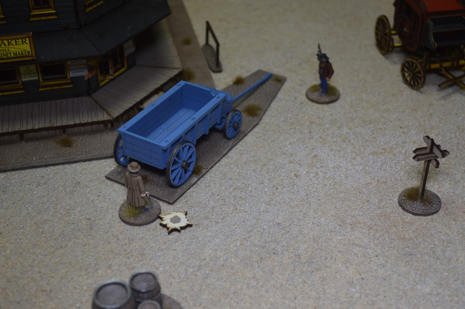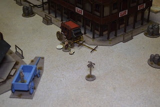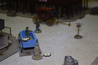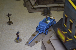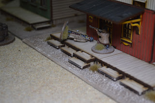 The first scene was In The Silence Of God.  I played the Pinkertons and Roy played the Outlaws.  In this scene one of my good guys sees a no good dirty bad guy sneaking around a wagon.  He checks it out and things turn bad.  Both sides have a single figure with another single figure in reserve.  Neither of our reserves made it onto the table as the scene ended when my good guy blew that no good varmint out of his boots with a 19 on the die roll!
