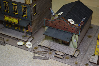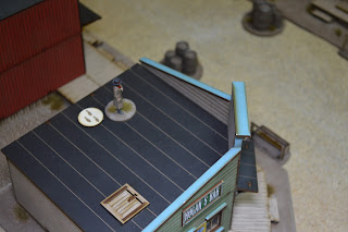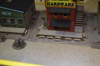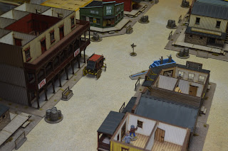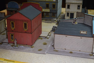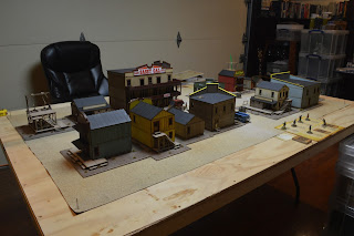 I pulled out my Dead Man's Hand stuff yesterday to play a game with Roy Scaife.  We played through The Dawn it Will Come scene ... more on this shortly.  I setup the town with the standard crossroad configuration.  This was the first showing for the old west town mat I purchased from Terrain Mat.  The mat worked out great and the added space allowed me to use all of my buildings I have built - with some space to spare (yay, I can build more buildings).