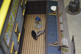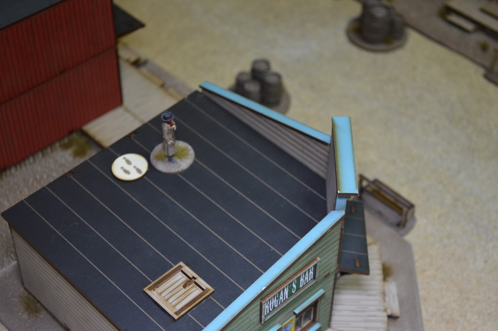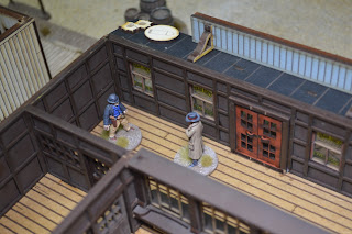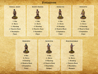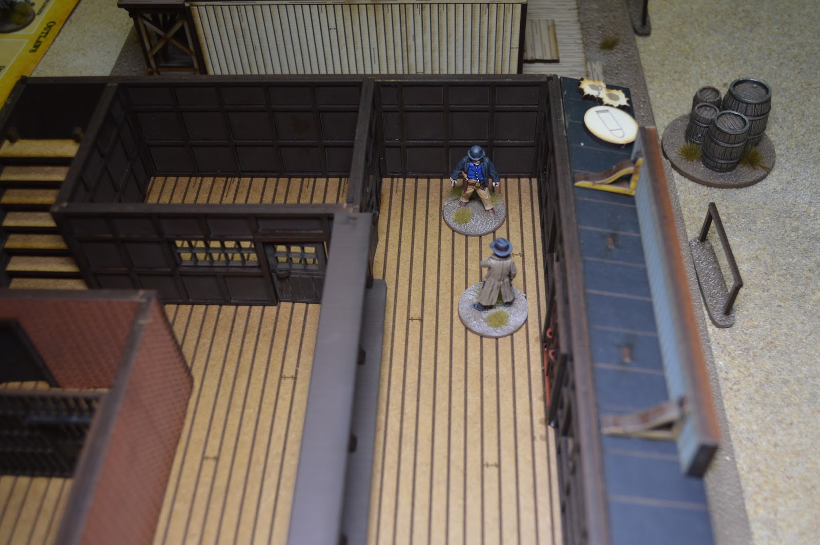The final scene was Dawn It Will Come.  It is now full on warfare in the streets!!  One gang ambushes the other in order to end things once and for all.  We both had our full gangs and I was able to once again draw an extra card into my hand.  As I also won the first scene I was deemed the ambusher and Roy's poor fellers the ambushees.  All of Roy's models had to start in the open (essentially out in the middle of the street) while my guys all started in the buildings (with the exception of one guy that had to be out with the rif raf.  This was a bloody encounter.  Apparently Pinkertons make horrible ambushers.  We both lost over half of our gang ... with Roy pulling out a big swing in the last two in two hand-to-hand combats that forced me over the half way mark.  We both owed big nerve tests in the last turn and I managed to pass mine while Roy failed his.  Sometimes it is better to be lucky than good!