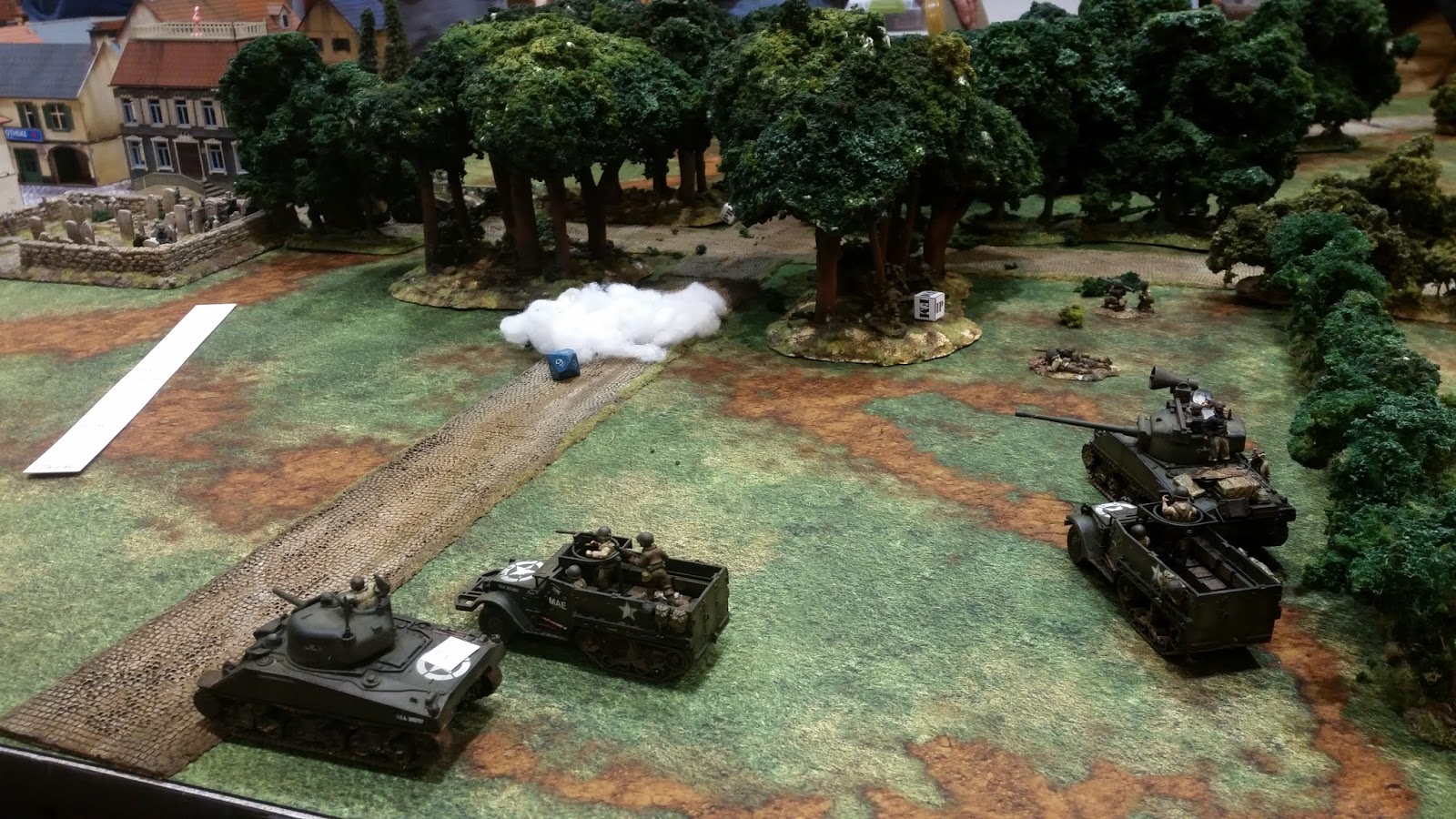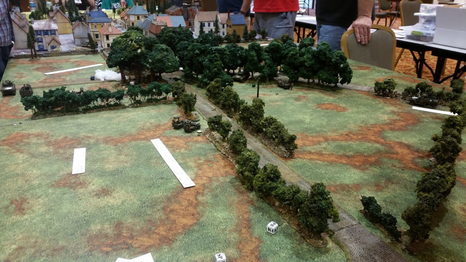 Some board games here and there and that wrapped up our Friday. Saturday morning I woke up early and headed down to the miniatures room to setup Hell's Highway. I made some major changes to the scenario (need to update my original post) ... but I reduce the forces on both sides and changed the town setup. These changes proved to be exactly what I needed!! I had a full roster for the game and we managed to play the entire game to a decisive conclusion in 3.5 hours! A big part of this was the group activation. I organized both sides into small combat teams consisting of 4-6 vehicles ... for those carrying infantry the vehicle count was lower. I put dice equal to the number of combat groups into the activation bag. When I pulled a dice that side would determine which player would activate their entire combat team. This worked very well.