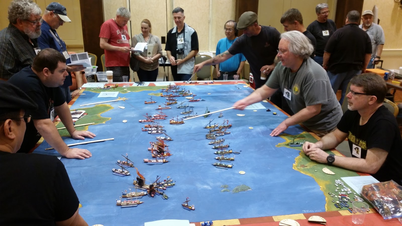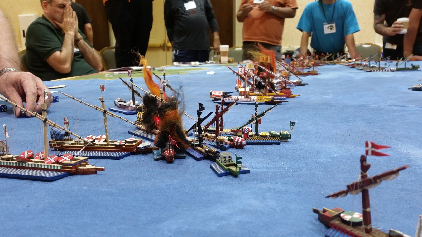 Another early morning, I got up and brought my ships down for Thomas Foss's game "The Battle of Lepanto - 1571" ... which I was helping him run. The game had around 65 ship models and an overly full roster of gamers itching to get into an awesome Renaissance naval brawl. Thomas also used his new custom painted mat that is based on a painting of the battle in the Vatican ... super cool! This was another bloody game, but the Holy League managed to keep history on their side.