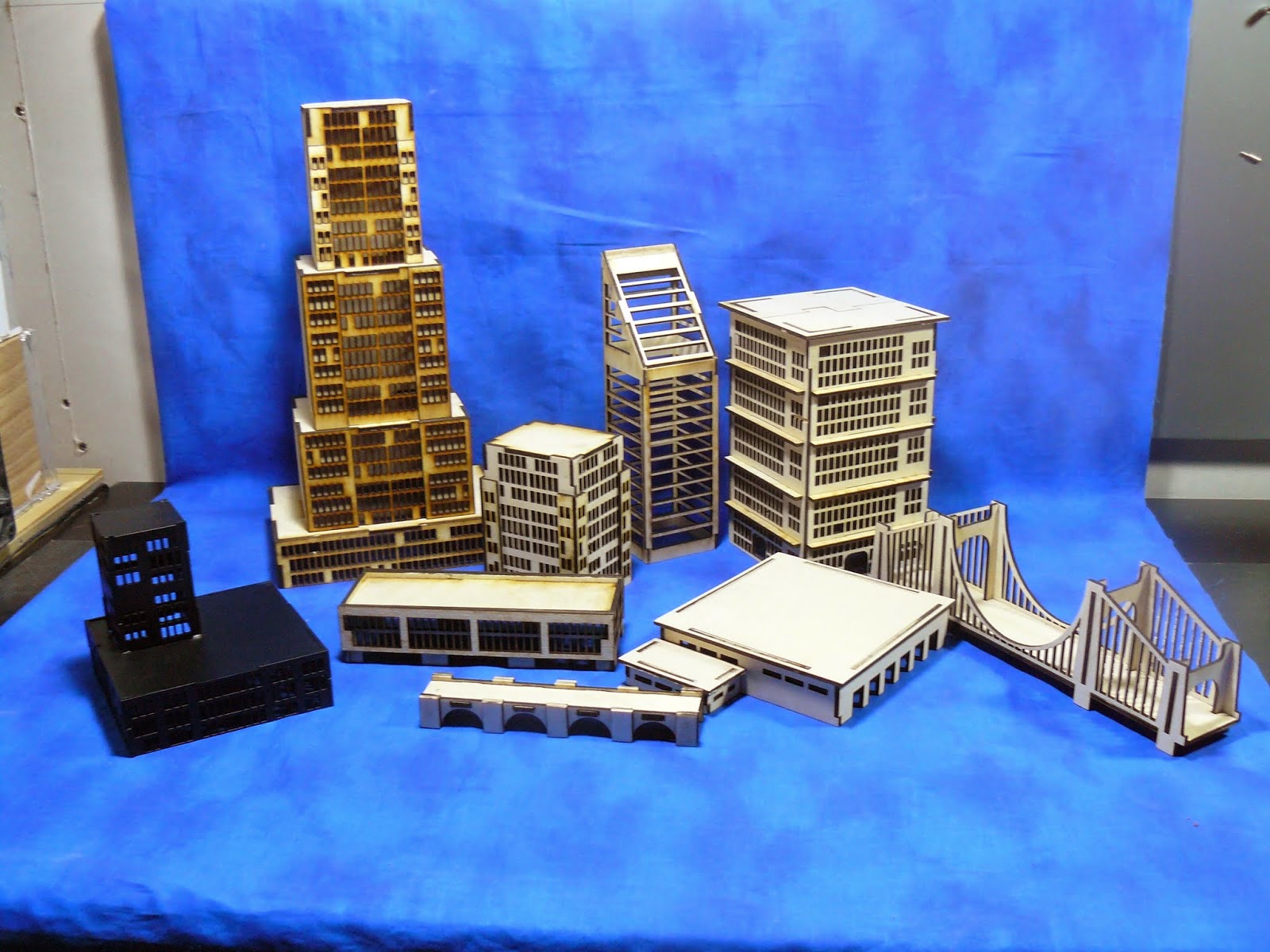 Burn In Designs also does laser cut buildings as well.  They have a nice range that includes some city bridges as well.