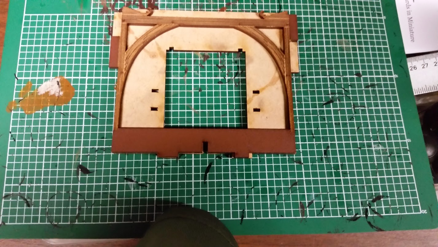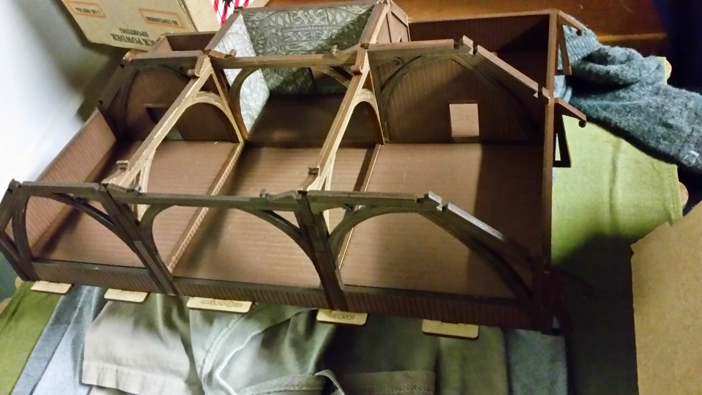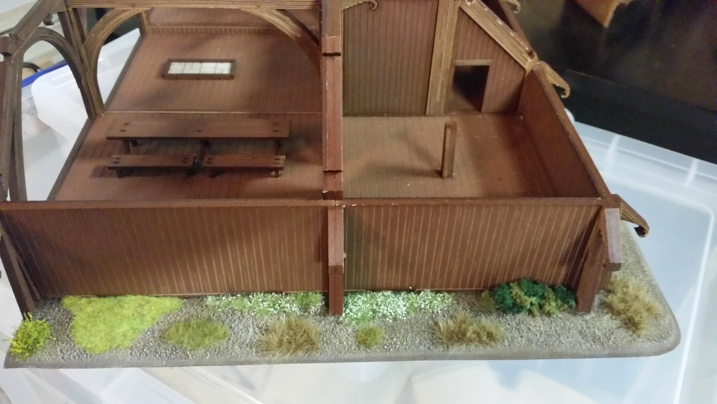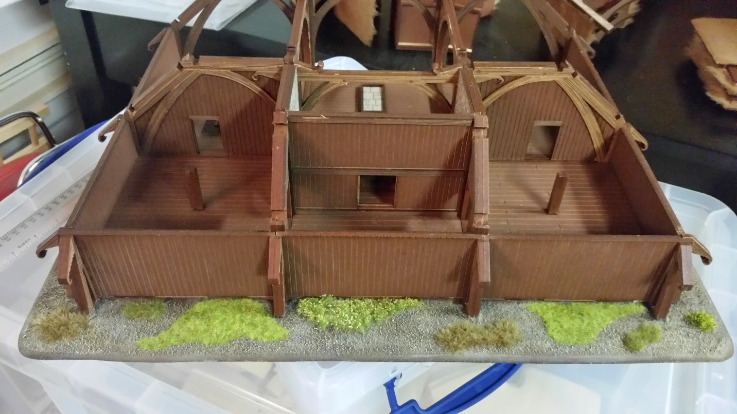 I decided to put the Great Hall on a base for additional effect. For storage purposes, I made sure the bases (front and back) were not larger than my storage bins. Notice the fascia is missing on the right side. It turns out the sprue was missing from the kit and 4Ground quickly sent one out via mail.